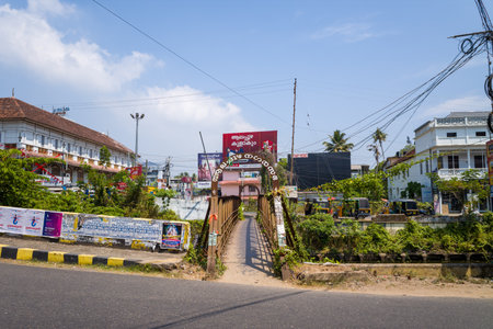 Alappuzha, India - March 7, 2023: A pedestrian bridge with an arched sign in Malayalam spans a canal in the city center, with traditional tiled-roof buildings, auto rickshaws, billboards, and power lines visible under a clear sky.