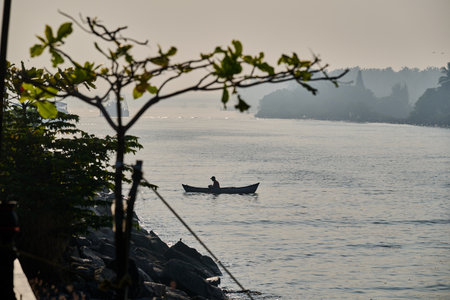 Silhouette of a fisherman on a boat in the river.