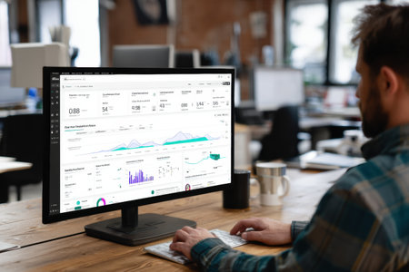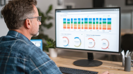 Businessman tracks various orders using a comprehensive dashboard interface while seated at a contemporary desk in a bright office environment.