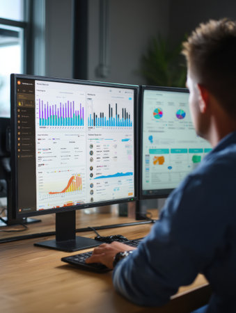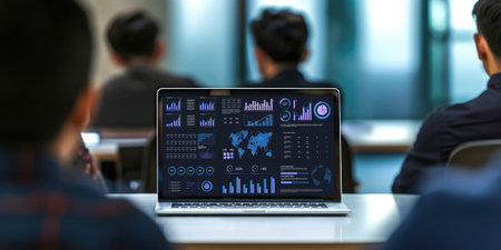 Modern data dashboard showcasing global statistics, interactive charts, and visualizations for business intelligence in a contemporary workspace, enhancing decision-making.