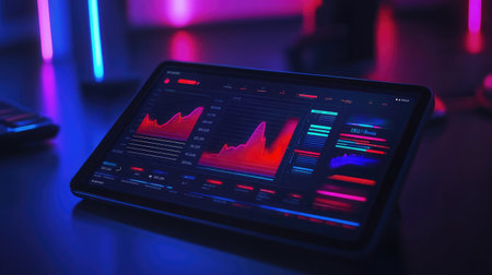 A minimalist workspace with a sleek tablet showing a simple yet informative business graph and key data points.