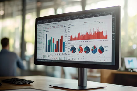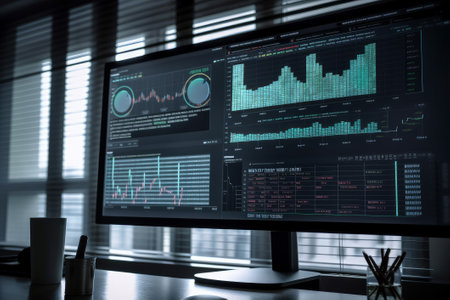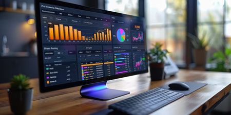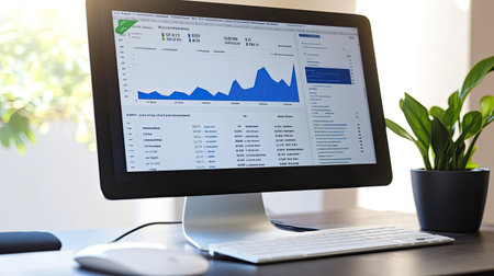 Modern office desk displays financial data on a monitor. The detailed analytics and graphs highlight business strategy and success, supported by data management and analysis tools.