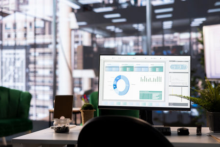 Executive workspace features a digital dashboard with financial charts and reports. This setup emphasizes productivity, data driven insights and planning for business growth and development.
