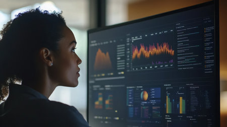 Professional woman analyzing data trends on a computer screen in a modern office workspace