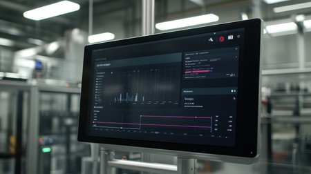 A focused shot of a large screen featuring realtime data visualization tools showcasing interactive segments filled with KPIs and metrics. The screen highlights areas of performanc
