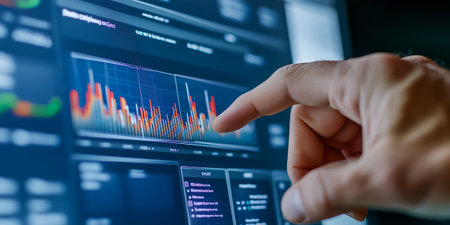 A close-up of a hand pointing at dynamic financial graphs on a digital screen