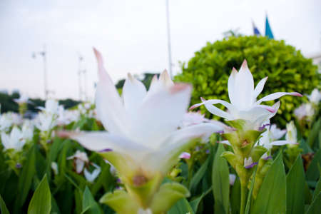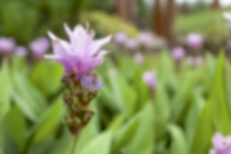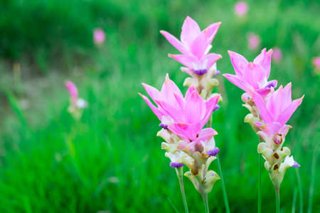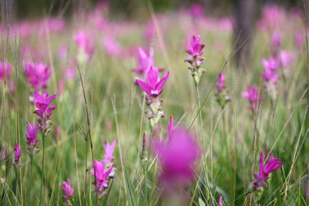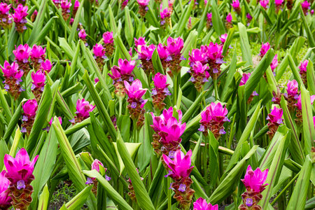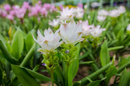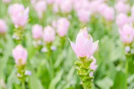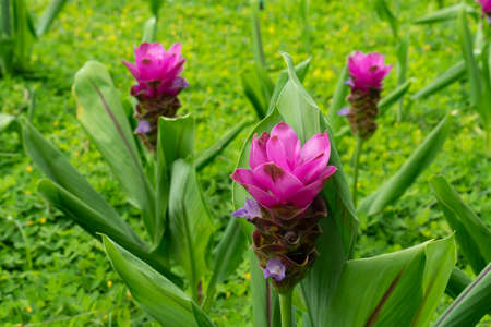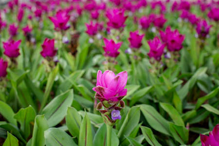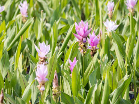Siam tulip flower ( Krachai flower ) or Curcuma sessilis flowers field are blooming in beautyful garden at Chaiyaphum province, Thailand.