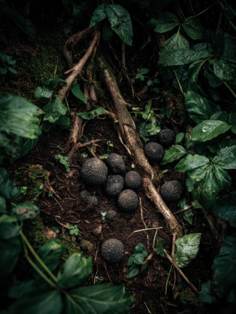 The ground shows earthy soil and oak roots, revealing black truffles hidden among the greenery. A perfect setting for culinary exploration.