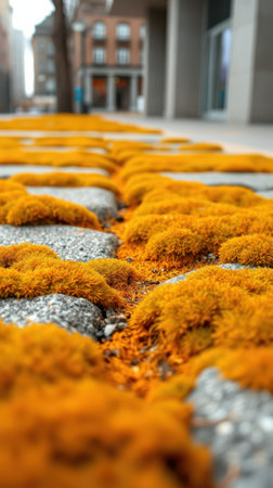Vibrant orange moss covers textured stone pathway in urban setting during daylight hours