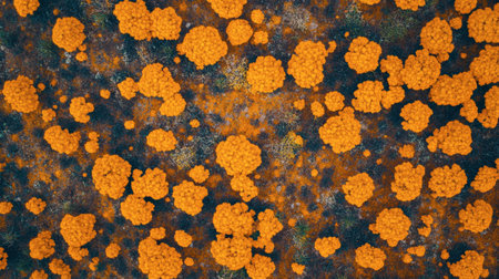 This aerial image captures vibrant orange flower clusters scattered across a lush green landscape, showcasing the beauty of nature's seasonal blooms.