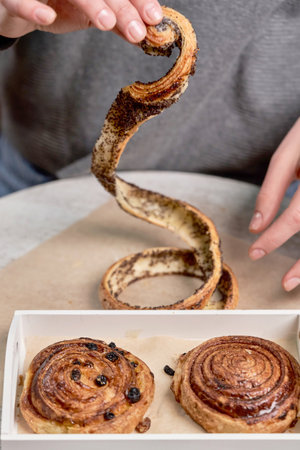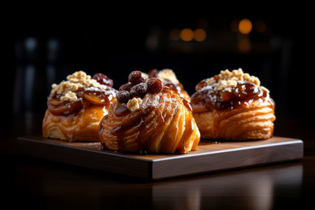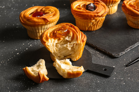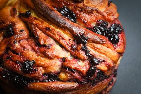 Cruffins with dried fruits, chocolate and black currants on a dark background.