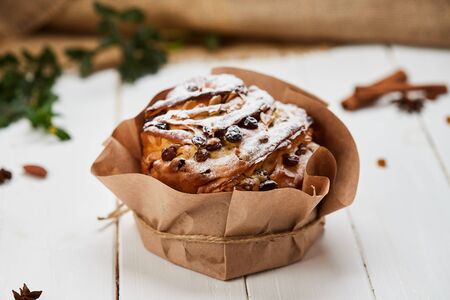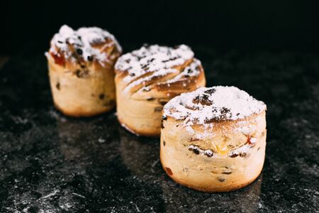 Cute cruffin with raisins and white sugar powder on it on black background. Fresh Easter pie or bakery concept. High quality photo