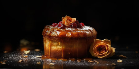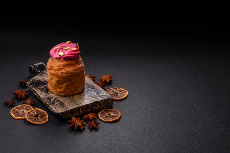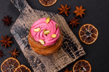 Sweet craffin or panettone garnished with raspberry and pistachio flavored cream on a dark concrete background