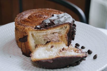 Close-up Shot of a Plate Sliced Chocolate Crombolomi. Blurred Foreground and Background.