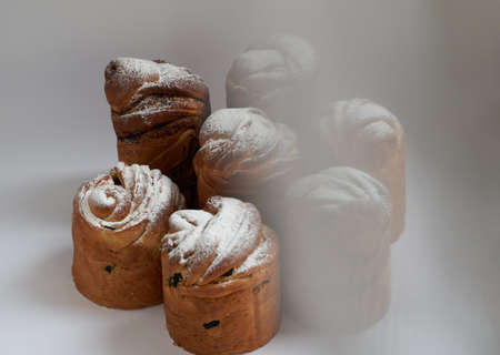 Easter cakes with white powder on a light background. Family values, religious holidays