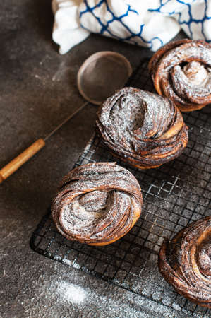 Cinnamon bun with sugar powder on a black background. Selective focus.