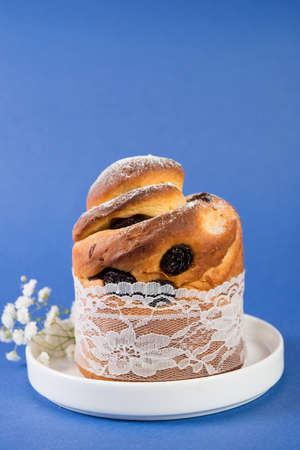 Easter holiday cake with raisins lies in a plate on a trendy blue background. Vertical close-up photo.