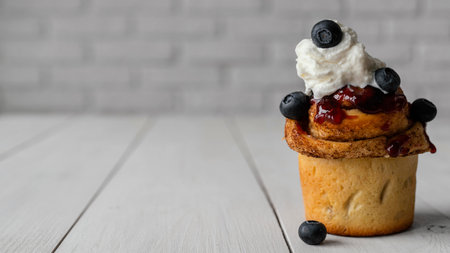 Bun with cinnamon and berries lying on the wooden table in cafe.