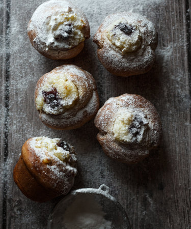 Modern fashionable pastries - scones cruffins (puffmaffin), a mixture of a croissant and maffin. On blue dark wooden table, sprinkled with powdered sugar. Copy space, top view