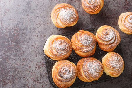 Modern fashionable pastries scones cruffins puffmaffin a mixture of a croissant and muffin closeup in the muffin pan on the table. Horizontal top view from above