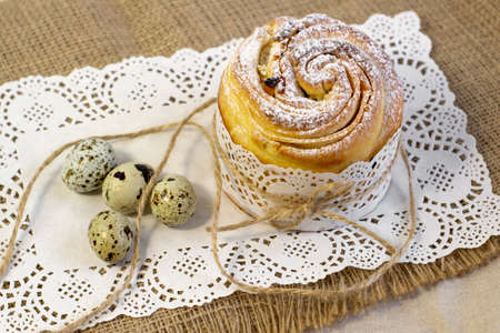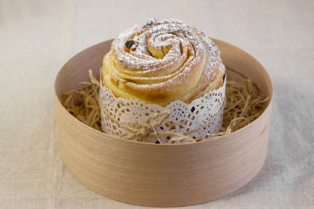 Easter Craffin dusted with powdered sugar. Kulich, pie wrapped in paper. Easter cupcake with powdered sugar