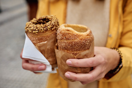 Close-up of woman holding two chimney cakes wrapped in paper with blurred city in background. Tourist enjoying freshly baked trdelnik at street in Prague, Czech Republic