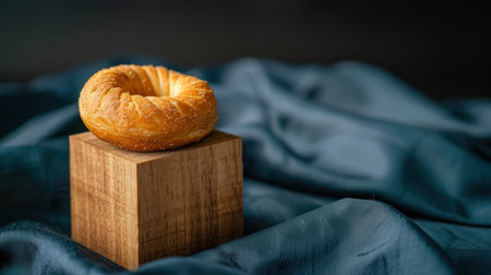 A freshly baked pastry resting on a wooden block, set against soft silk fabric, creating an elegant atmosphere perfect for food styling or culinary photography.