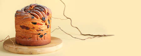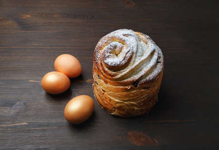 Panetone kulich craffin on wooden background. Easter bread kozunak. copy space concept.