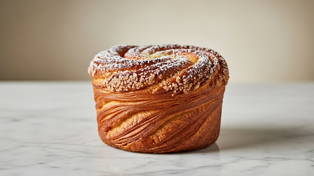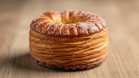 Sweet craffin made from puff pastry with Swiss meringue on a dark textured background