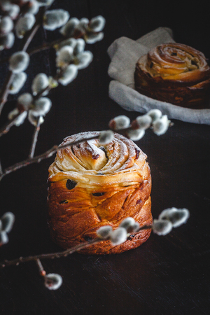 Easter cake kranch with icing sugar on a dark background and with willow flowers.