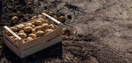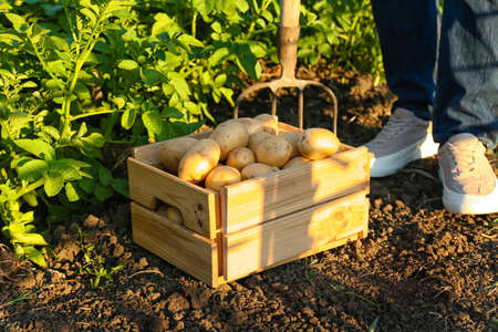 a wooden box with potato in field or garden in the morning, organic potato