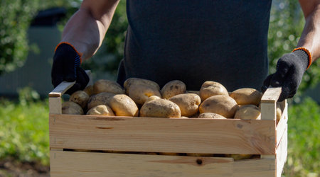 wooden box full of potatoes. Agriculture, gardening, growing vegetables created with Generative AI technology.