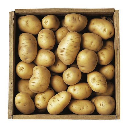 A collection of freshly harvested potatoes arranged neatly in a wooden crate, nestled in rich soil with lush greenery in the background, ideal for agricultural themes.