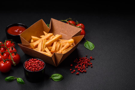 Delicious crispy french fries with salt and spices in a cardboard box on a dark concrete background