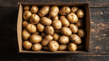Freshly harvested potatoes in a cardboard box on a wooden surface, ready for cooking and enjoying seasonal dishes