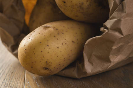 fresh raw potatoes in paper bag on wood background