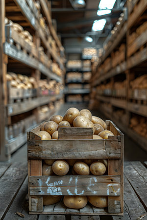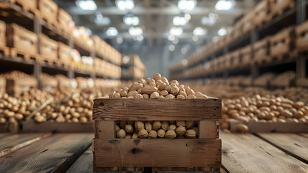 a wooden crate filled with potatoes is sitting on a wooden table in a warehouse