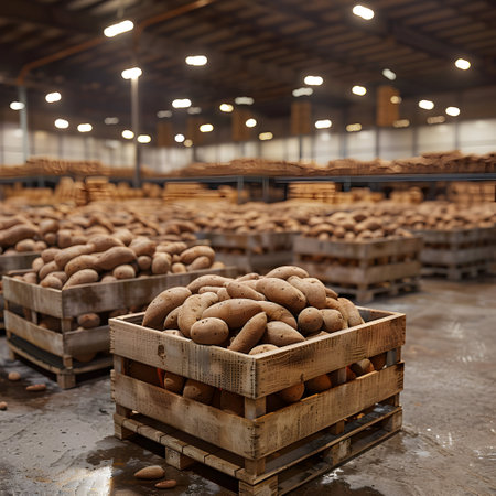 Sweet potatoes harvested in wooden boxes in a warehouse. Natural organic fruit abundance. Healthy and natural food storing and shipping concept.