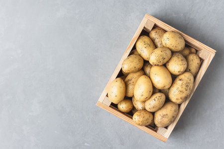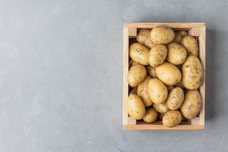 Raw yellow organic potatoes in a wooden box. Gray background. Top view.