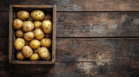 A rustic outdoor market scene featuring earthy, newly dug potatoes spilling from a wooden crate, evoking freshness and farm-to-table appeal for culinary use.