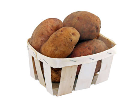 Wooden crate of potatoes close up on white background