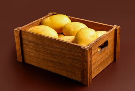 Fresh potatoes in a wooden box.