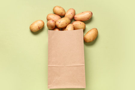 Paper bag with raw baby potatoes on green background