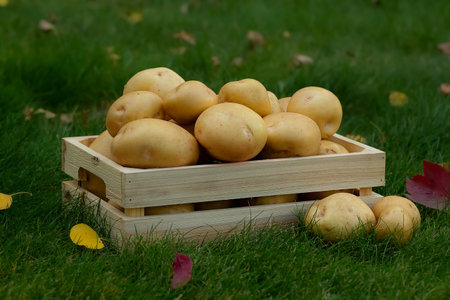 Yellow big potatoes, Yukon gold variety in the wooden crate box on the green lawn with autumn yellow and red leaves