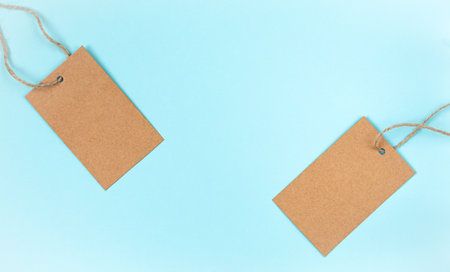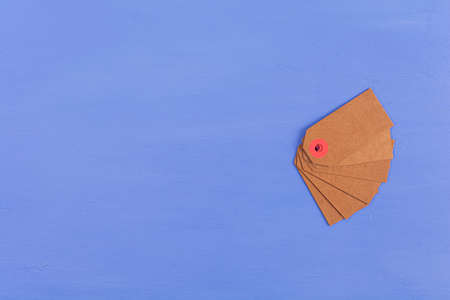 Blank craft paper cloth tag or label on blue background.