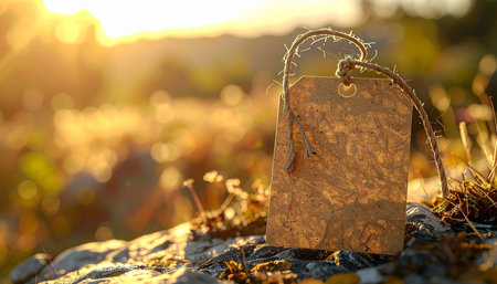 An empty kraft paper tag with twine sits on a rock in the warm glow of golden hour sunlight.