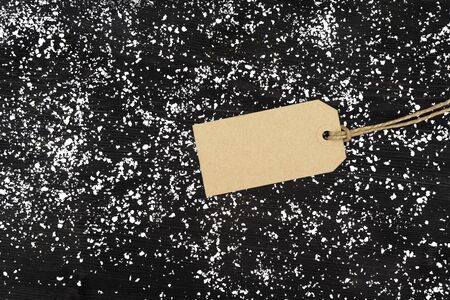 brown cardboard label with a thin cord on a black fabric background. Background, holiday concept.