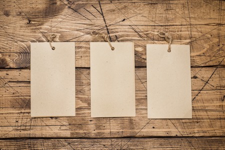 blank paper price tag with a long twine against grained rustic wood, shopping concept
