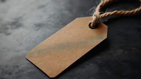 A simple blank brown paper tag hangs from rustic twine against a deep black background. Ideal copy space for text or logos, perfect for showcasing sales, prices, or branding. Use for retail, crafts, g