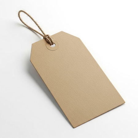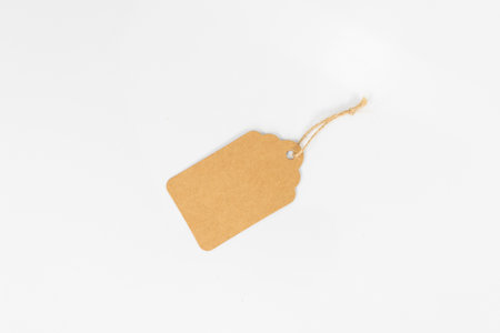 Blank cardboard tag with twine, suspended on white, minimalist design for pricing, packaging or eco branding
